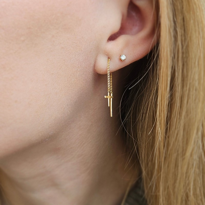 Disse elegante kædeøreringe i 8 kt guld er et smukt valg, når du ønsker et feminint smykke med et moderne twist. Øreringene er designet med en fin kæde, der trækkes igennem øret, så de får et let og bevægeligt udtryk, der fanger lyset smukt, når du har dem på. På kæden sidder et lille kors, som tilfører et enkelt men markant symbolsk element, der gør øreringene både personlige og tidløse.