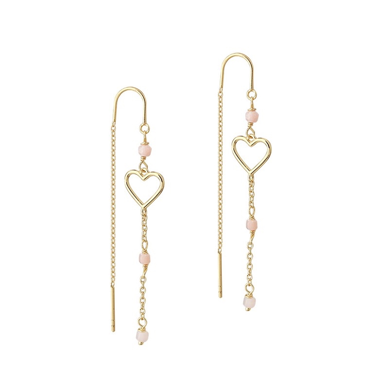 De slanke kæder skaber bevægelse og lethed, mens de små, lyse perledetaljer giver en fin kontrast og afrunder designet på en rolig og harmonisk måde. Kombinationen af det enkle hjerte og de diskrete detaljer gør øreringene nemme at bære både til hverdag og til særlige anledninger.