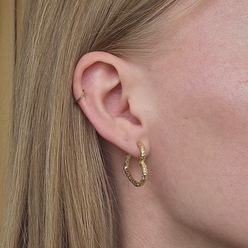 Overfladen er hamret, hvilket giver øreringene en rå tekstur og en levende struktur, som fanger lyset på en særlig måde. Denne finish står i flot kontrast til den varme, gyldne tone i forgyldningen og skaber en balance mellem det feminine og det mere rustikke. Resultatet er et sæt hoops, der både er romantiske og moderne på samme tid.