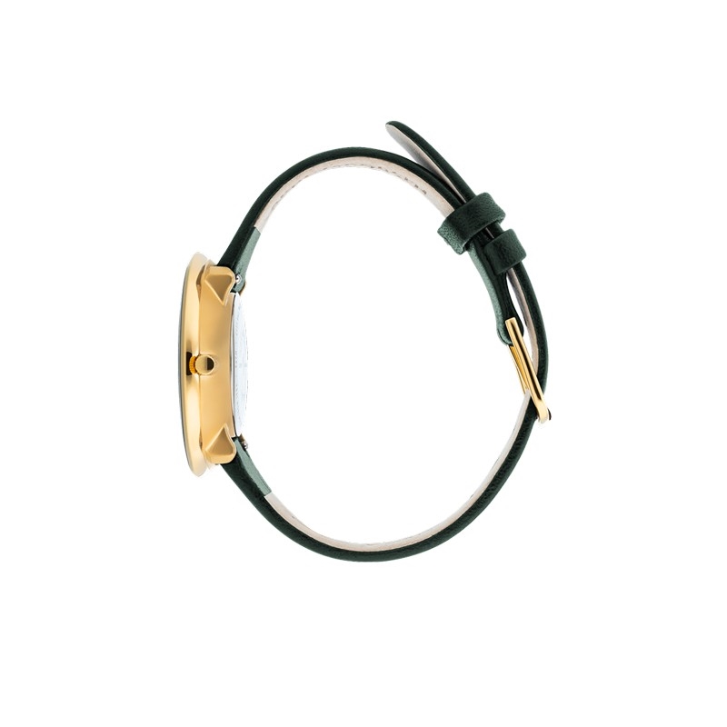 City Hall Evergreen ur med grøn urskive og lækker grøn læderrem. Urhuset og spændet er i børstet gulddublé stål og læderremmen er lavet i kalveskind, i indfarvet grøn på ydersiden og neutral på indersiden.