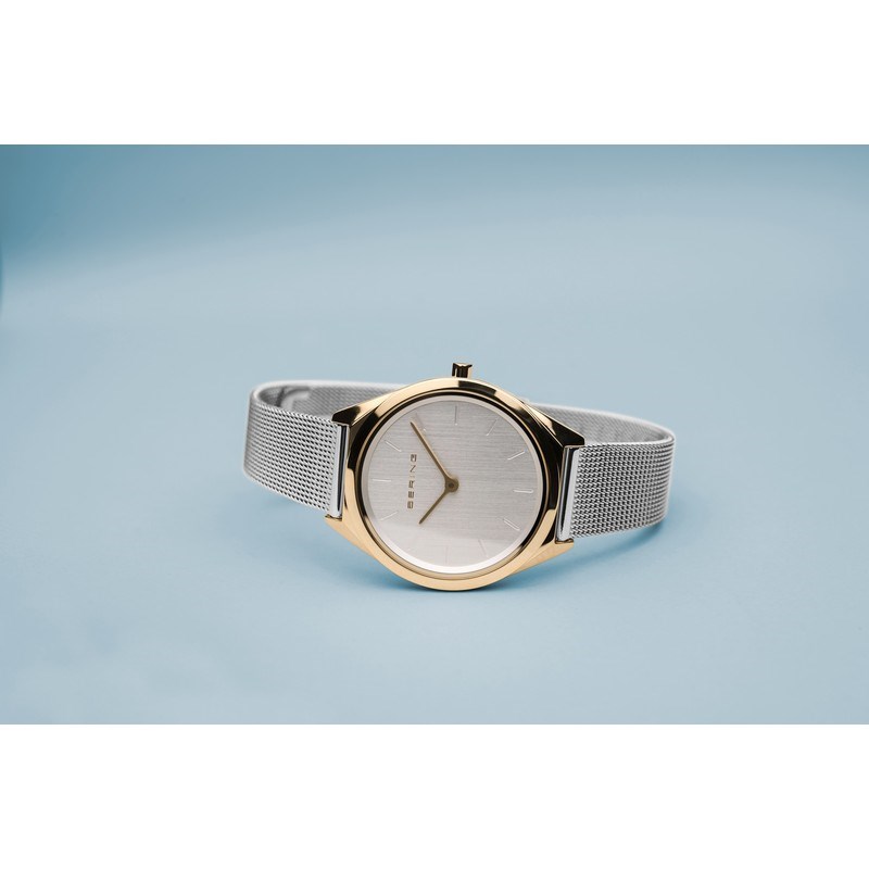 Ultra slim Bering dameur med urskive i børstet look og urhus i poleret guld. Milanaise remmen er enkelt og smuk i sølv stainless steel.