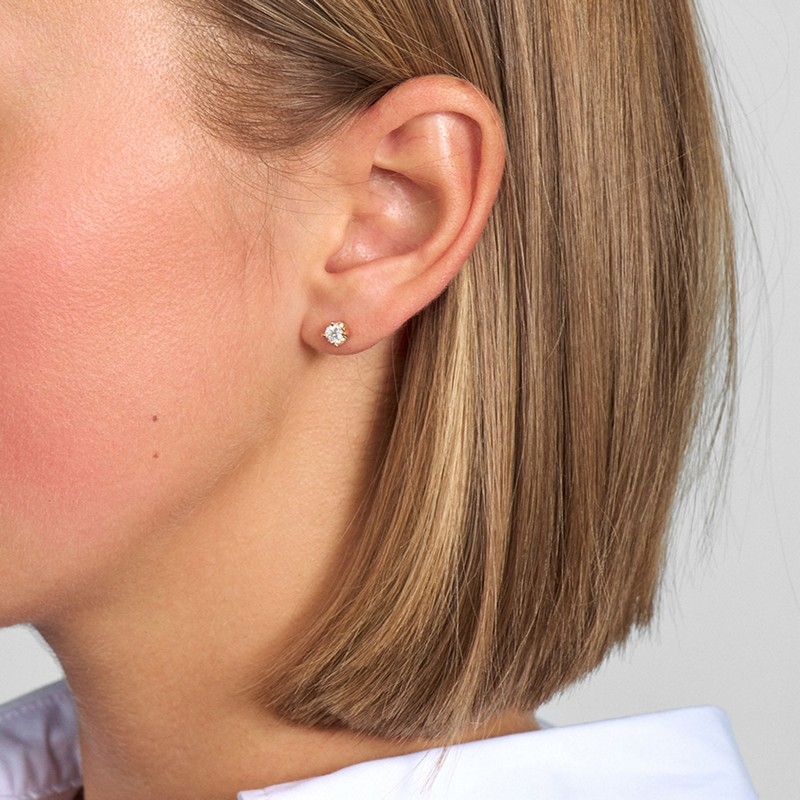 Diamanterne har kvalitet Wesselton (W) / SI, hvilket garanterer en smuk hvid farve og høj klarhed. Slibeformen er brilliant, som er kendt for at fremhæve diamantens naturlige ild og glans. Ørestikkerne fås med diamantstørrelser fra 0,09 ct. op til 0,50 ct., så du kan vælge netop den størrelse, der passer til din stil og dit ønske om udtryk.
