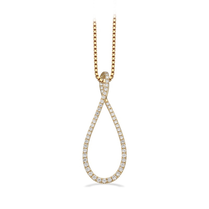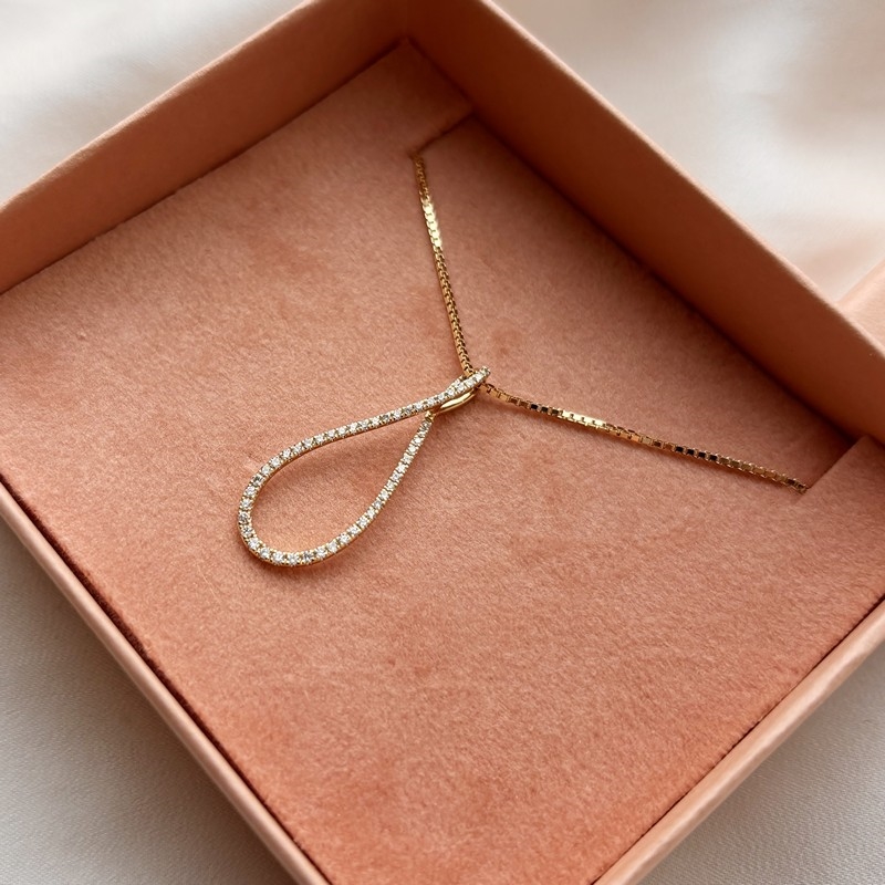 Denne smukke Dazzling halskæde i 14 karat guld er et elegant valg til dig, der ønsker et klassisk smykke med et diskret strejf af luksus. Vedhænget er designet som en elegant, snoet dråbe, der starter øverst med en blød og let buet linje, som drejer en smule, og fortsætter ned i en aflang dråbeform, der er åben i midten. Formen giver et raffineret udtryk, der minder om en let drejet løkke eller et diskret infinity-twist.