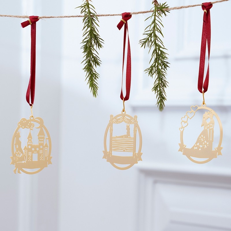 4 forgyldte ophæng med "Prinsessen på ærten". De fire ovale ophæng bliver leveret i en lækker lille gave eller opbevaringsæske og kan bruges til både påske og jul. Hvert lille ophæng, måler 6 x 4,5 cm og er udformet i messing og belagt med 18 karat guld.