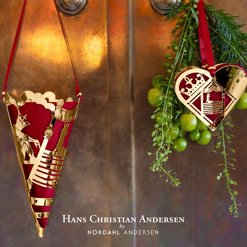 Forgyldt kræmmerhus med "Prinsessen på ærten". I mønstret rundt om kræmmerhuset er det fineste mønster med det skønne motiv. Kræmmerhuset er foret med rød filt og er perfekt til julegodterne på juletræet.