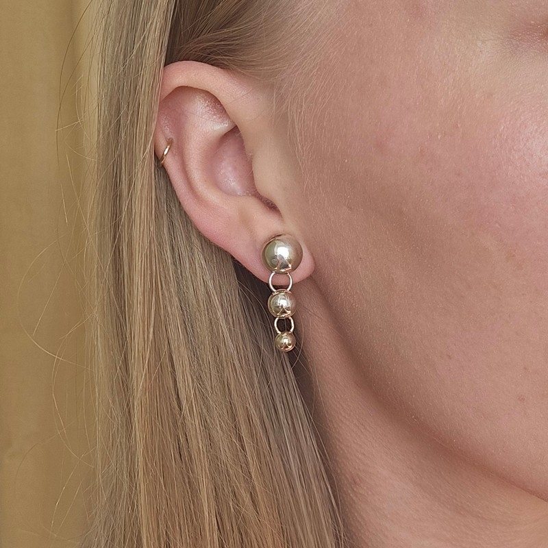 Atomic Drop Stud i blank sølv fra Jane Kønig måler fine 2,5cm i længden og består af 3 kugler i forskellige størrelser. Øreringene er smukke at kombinere med den store Big Atomic Drop Stud for et eksklusivt look i sølv.