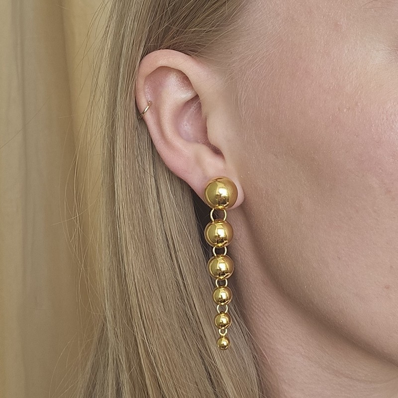 Big Atomic Drop Stud fra Jane Kønig er en markant og stilfuld ørering i forgyldt sølv, der måler 6,5 cm i længden. Designet består af en række kugler, der gradvist bliver mindre, jo længere de bevæger sig væk fra øreflippen. Den enkle, men skulpturelle form giver øreringen et moderne og sofistikeret udtryk, mens den blanke overflade tilfører et eksklusivt spil i lyset. Resultatet er et statement-smykke, der både er dramatisk og elegant på samme tid.