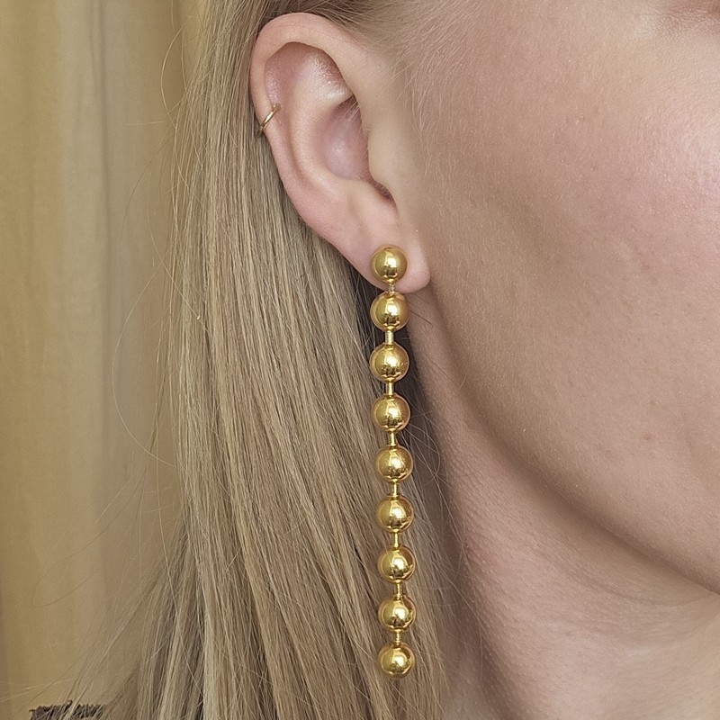 Big Atomic Chain øreringen fra Jane Kønig er et iøjnefaldende smykke i forgyldt sølv, designet til dig der ønsker at skabe et markant statement. Med en længde på hele 87 mm får du en lang og elegant ørering, hvor de ens kugler er sat sammen i en kæde, der bevæger sig smukt, når du har den på. Den blanke overflade reflekterer lyset på en måde, der fremhæver øreringens skulpturelle formsprog og giver dit look et eksklusivt præg.