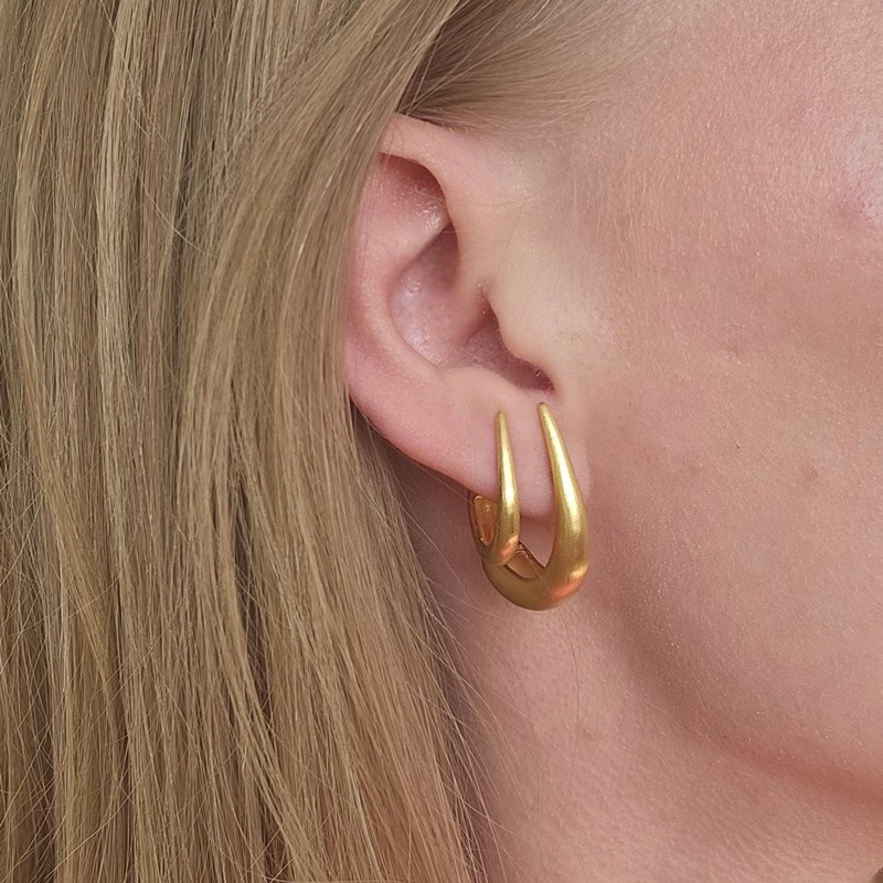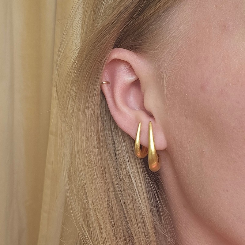 Designet fremstår enkelt, men med tydelig karakter. Den bløde dråbeform skaber et klassisk og harmonisk udtryk, mens den blanke forgyldte overflade tilfører eksklusivitet og elegance. Resultatet er en ørering, der både kan fungere som et tidløst hverdagssmykke og som en smuk detalje til festlige lejligheder.
