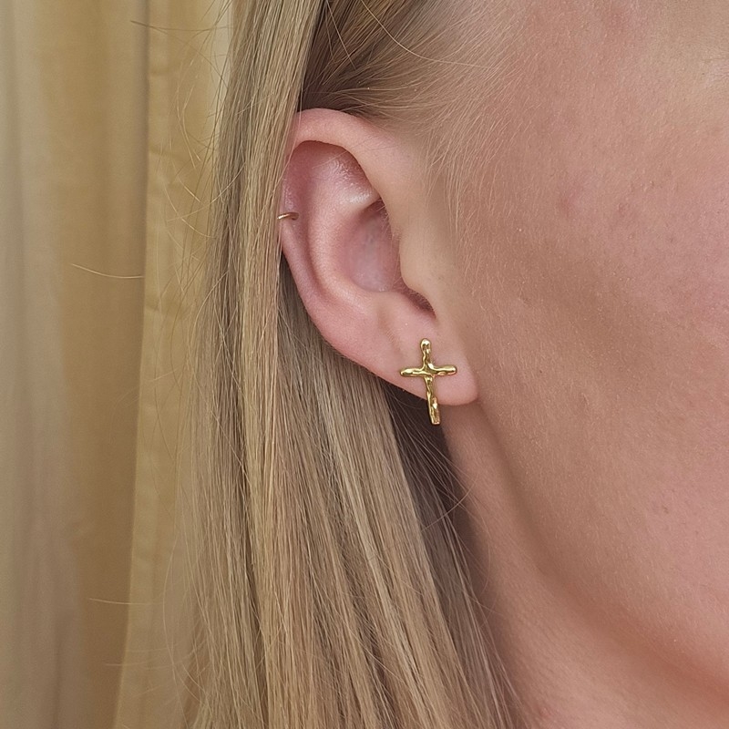 Mary ørering i forgyldt sølv fra Jane Kønig med lille kors. Øreringen har et kors der måler 15 mm i højden med en overflade i blank guld med en let "organisk" overflade.
