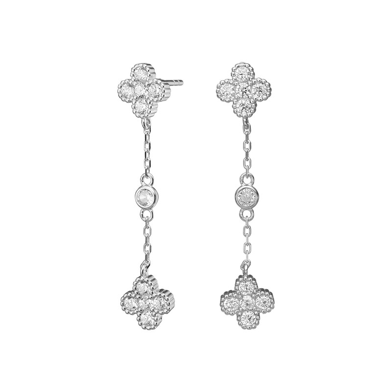 Designet består af et lille firkløverformet motiv øverst, smukt besat med klare kubiske zirkonia. Herfra falder en fin kæde, der giver øreringene et let og levende udtryk. Midt på kæden sidder en enkelt sten, og nederst gentages firkløvermotivet, så designet hænger naturligt og balanceret.