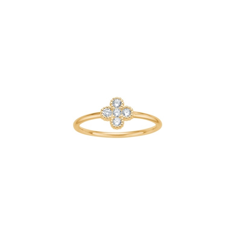 Kombinationen af den varme glød fra guldet og de klare zirkonia gør ringen nem at style. En tidløs ring med feminine detaljer, der passer perfekt ind i enhver smykkesamling.