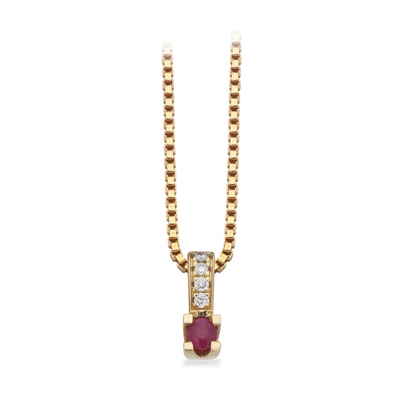 Elegant vedhæng i 14 karat guld med en rød rubin og i alt 0,02 carat brillanter. Vedhænget er en del af den farvede Kleopatra Queen diamant smykkeserie og findes med enten safir eller som her rubin.