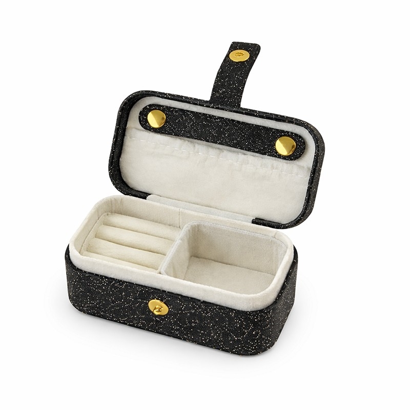 Det sorte ydre har et diskret glimmerspil, som giver smykkeskrinet et fint udtryk uden at virke for prangende. Det gør det både anvendeligt til hverdag og til rejser, hvor du gerne vil have en pæn og funktionel opbevaring.