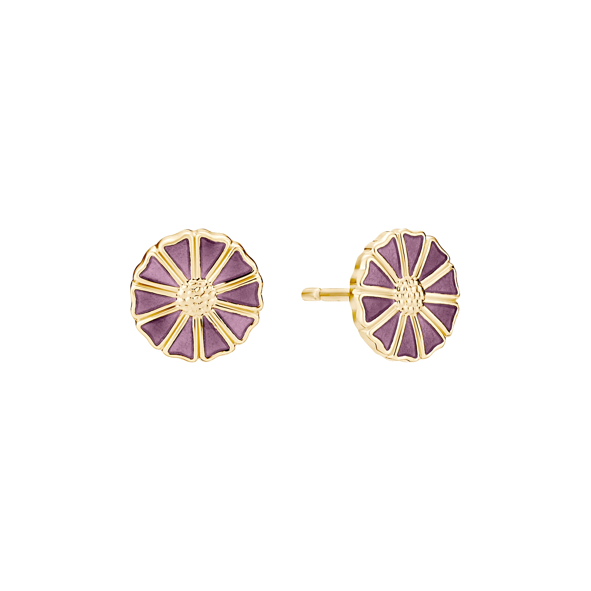 Ørestikkerne er fremstillet i sterlingsølv og belagt med 24 karat guld, hvilket giver en varm gylden glød og en slidstærk overflade. Den lilla emalje står flot i kontrast til guldbelægningen og fremhæver marguerittens fine detaljer på en elegant måde.