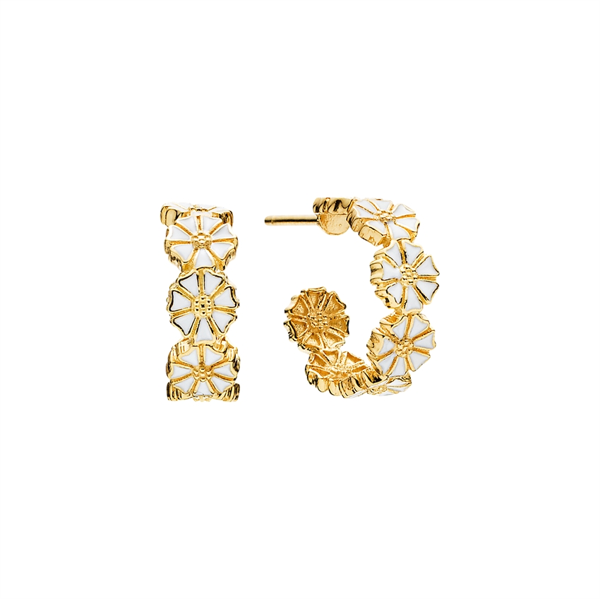 Disse marguerit creoler er et smukt eksempel på klassisk dansk smykkedesign med et feminint og tidløst udtryk. Øreringene er dekoreret med de ikoniske margueritblomster, der elegant følger creolens form og skaber et harmonisk og levende look. Den hvide emalje giver blomsterne et let og rent udtryk, som står flot i kontrast til den varme gyldne overflade.