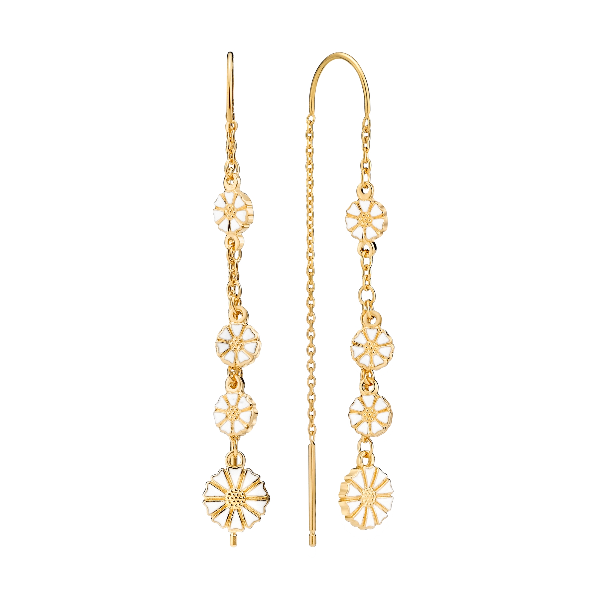 Ørehængerne er fremstillet i 925 sterlingsølv og belagt med 24 karat guld, hvilket giver en varm gylden glød og en holdbar overflade. Margueritterne er dekoreret med hvid emalje, som fremhæver blomstens form og skaber en smuk kontrast til guldbelægningen. De mindre margueritter måler 3 x 5 mm, mens den større marguerit måler 1 x 7,5 mm, hvilket giver et elegant og afbalanceret design.