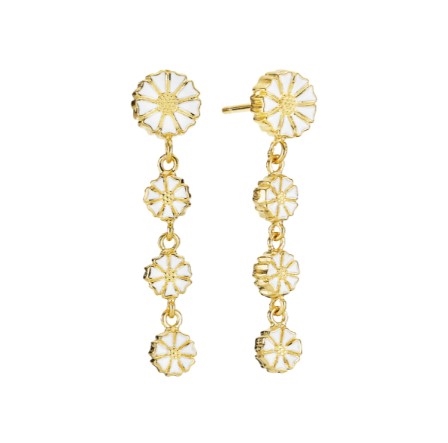 Ørehængerne er fremstillet i 925 sterlingsølv og belagt med 24 karat guld, hvilket giver en varm og eksklusiv overflade. Margueritterne er dekoreret med hvid emalje, som fremhæver blomstens ikoniske form og skaber en flot kontrast til guldbelægningen. De mindre margueritter måler 3 x 5 mm, mens den større marguerit måler 1 x 7,5 mm, hvilket giver et elegant og velafbalanceret design.