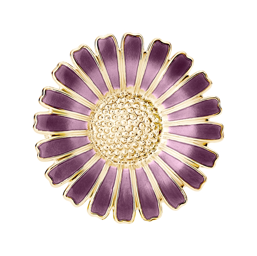 Brochen måler 36 mm og er fremstillet i 925 sterlingsølv, belagt med 24 karat guld for en varm og eksklusiv finish. De lilla emaljerede kronblade tilfører et raffineret og moderne twist til det klassiske margueritmotiv og skaber en smuk kontrast til den gyldne midte og kant.