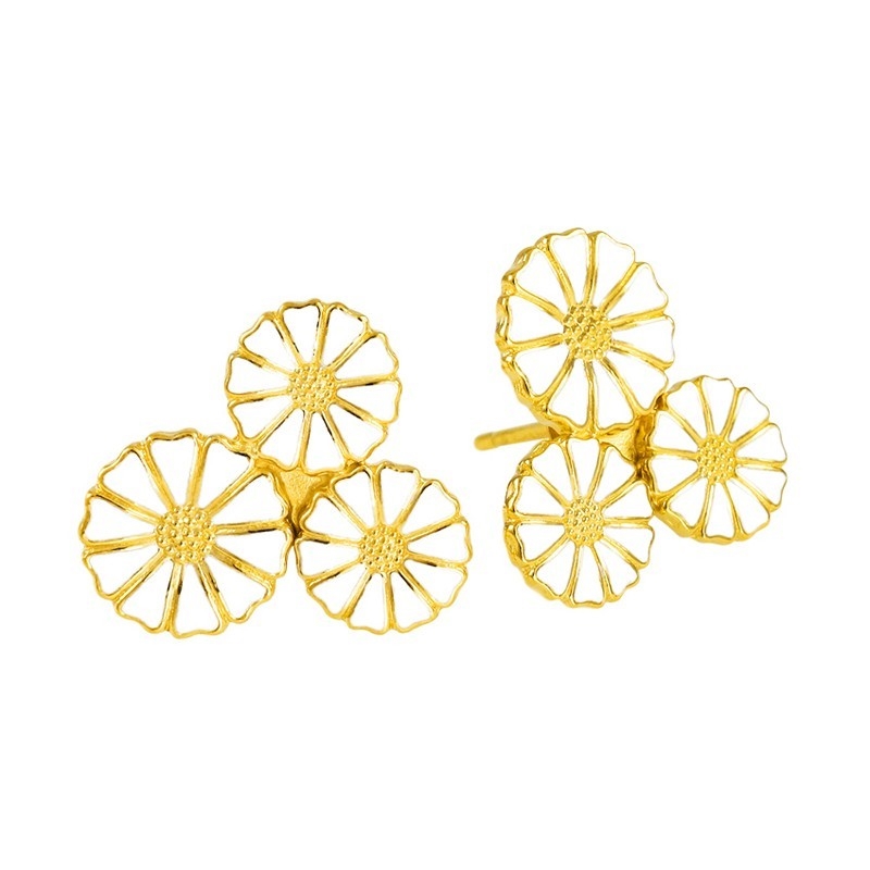Disse smukke marguerit øreringe fra Lund Copenhagen er et klassisk valg for dig, der ønsker et tidløst smykke med et feminint udtryk. Øreringene er udført i sterlingsølv belagt med 24 karat guld og prydet med tre margueritter i to forskellige størrelser. To af blomsterne måler 7,5 mm, mens den tredje er lidt større på 9,5 mm. Kombinationen af størrelser giver et harmonisk og legende design, som gør øreringene elegante og iøjnefaldende på samme tid.
