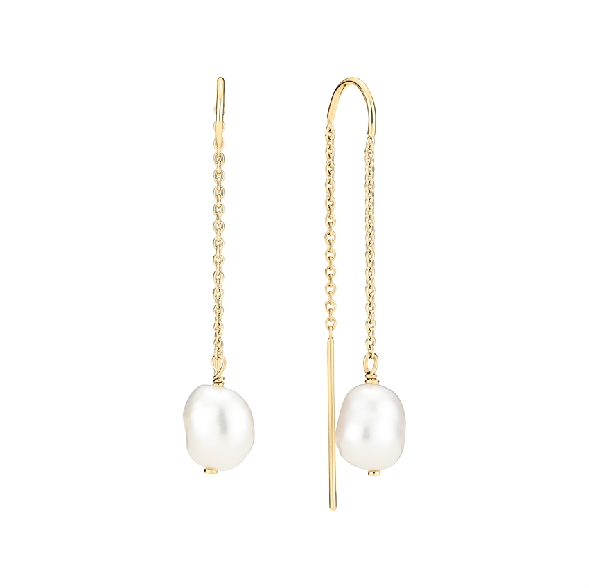 Ørehængerne er fremstillet i 925 sterlingsølv og belagt med 14 karat guld, hvilket giver en varm gylden finish og en holdbar overflade. De hvide ferskvandsperler har hver deres unikke form, hvilket gør hvert par ørehængere helt særlige og understreger smykkets naturlige elegance.