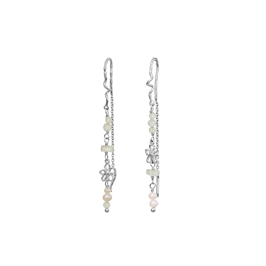 Perleøreringene bevæger sig let, når du gør, og skaber et levende og luftigt udtryk. De små blomsterdetaljer og de lyse prehnit sten kombineret med ferskvandsperlen giver et harmonisk spil mellem det romantiske og det naturlige. Resultatet er et smykke med både ynde og karakter.