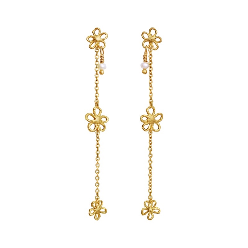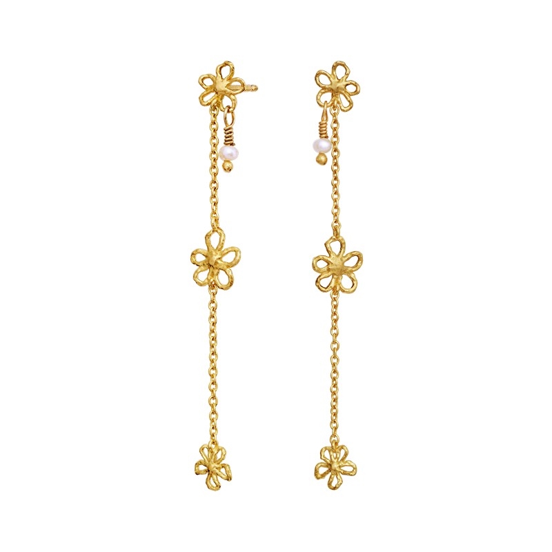 Nicola øreringe fra Maanesten er lange og feminine kædeøreringe i forgyldt sølv med blomster og ferskvandsperler. Designet kombinerer de klassiske perler med nogle af sommerens stærkeste symboler og skaber et smykke, der både føles romantisk og let. Hvem elsker ikke perleøreringe? Her får du en moderne fortolkning, hvor perlerne møder fine blomsterdetaljer i et harmonisk og levende udtryk.