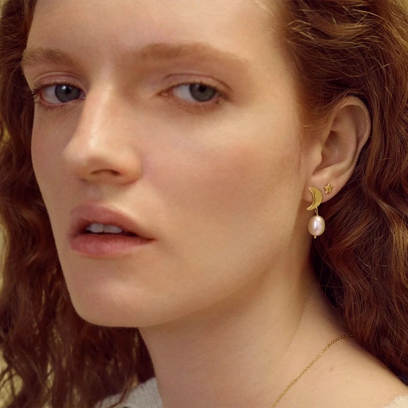 Disse øreringe kombinerer en elegant halvmåne med en strålende stjerne, som hver især hænger smukt og let fra øret. Udtrykket er drømmende, poetisk og fyldt med den bløde energi, som Maanesten er så kendt for. Formen har en håndlavet følelse, hvor de små organiske detaljer giver smykket karakter og charme. De er perfekte til dig, der elsker et drømmende udtryk og gerne vil tilføje noget personligt og symbolsk til din stil. Brug dem alene for et rent look eller kombiner dem med andre fine Maanesten øreringe for et mere lag-på-lag udtryk.