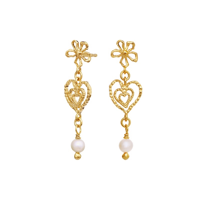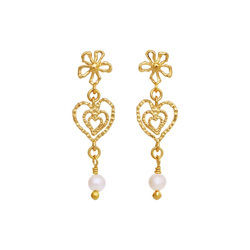 Izabel øreringe fra Maanesten er feminine og detaljerige øreringe i forgyldt sølv med ferskvandsperler. Designet kombinerer små hjerter og fine blomster med de smukkeste perler, hvilket giver et blødt og romantisk udtryk. Øreringene måler 28 x 7,2 mm og har en let størrelse, der gør dem behagelige at bære hele dagen.