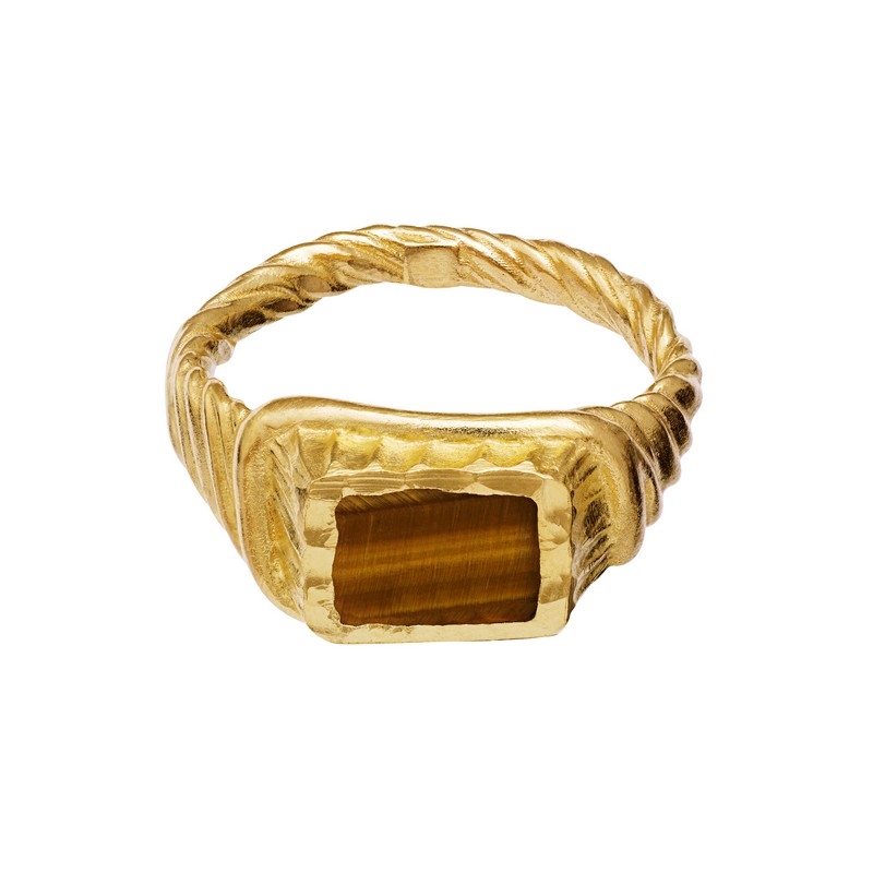 Kim ring i forgyldt sølv fra Maanesten. Den cool Kim ring er en Signet ring med en helt fantastisk Tigerøjesten indrammet af det klare metal. Overfladen i ringens forgyldte sølv er organisk mønstret med en synlig struktur.
