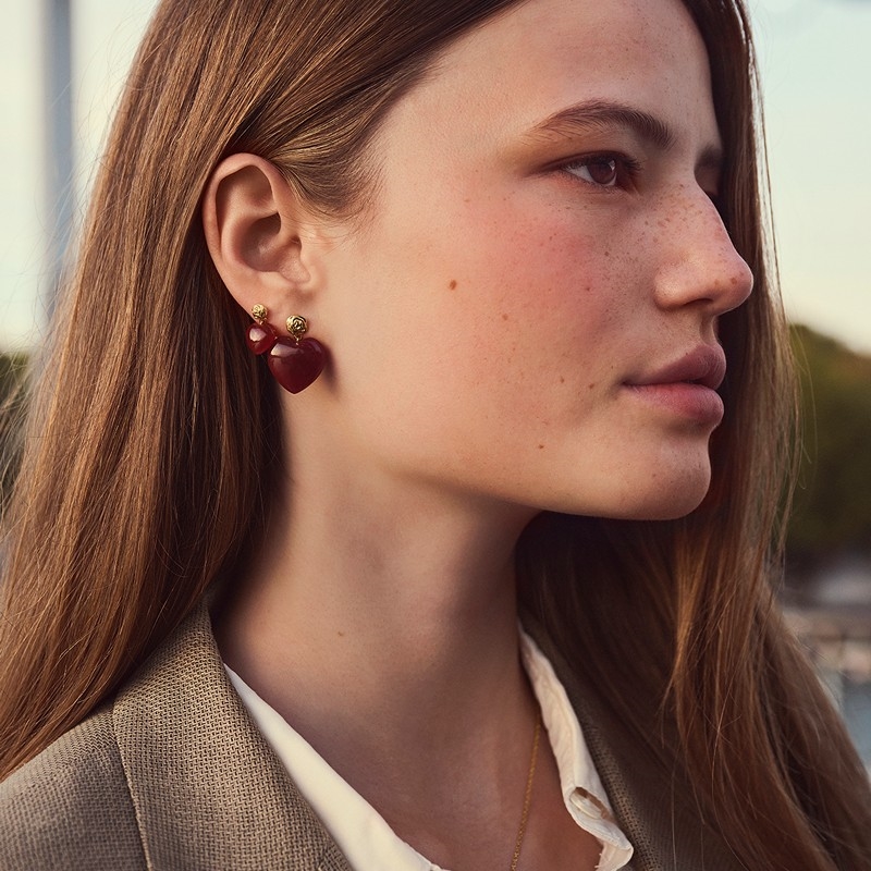 Hjertet er udført i rød jade, en sten som i mange kulturer forbindes med balance, ro og beskyttelse. Den røde farve symboliserer samtidig kærlighed, passion og styrke. Kombinationen af materialet og farven giver Rubina Heart øreringene en særlig betydning og gør dem til mere end blot et dekorativt smykke. De udtrykker følelse og personlighed, samtidig med at designet forbliver enkelt og stilrent. Øreringene kan derfor bæres alene for et roligt og feminint look eller kombineres med andre smykker for et mere personligt udtryk.