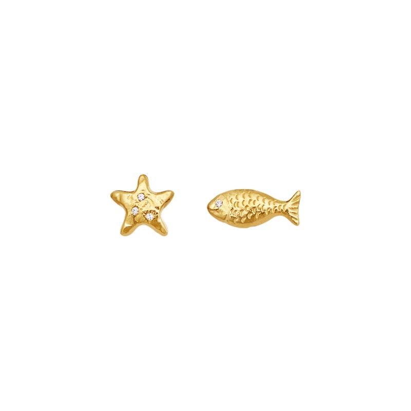 Ruta øreringe i forgyldt sølv fra Maanesten er et par fine og asymmetriske ørestikker, formet som en lille fisk og en søstjerne. Designet er inspireret af havets former og symboler og indfanger den lette og varme stemning, som sommeren bringer med sig. De små detaljer giver et legende, men stadig elegant udtryk, der passer perfekt til både hverdag og ferie.