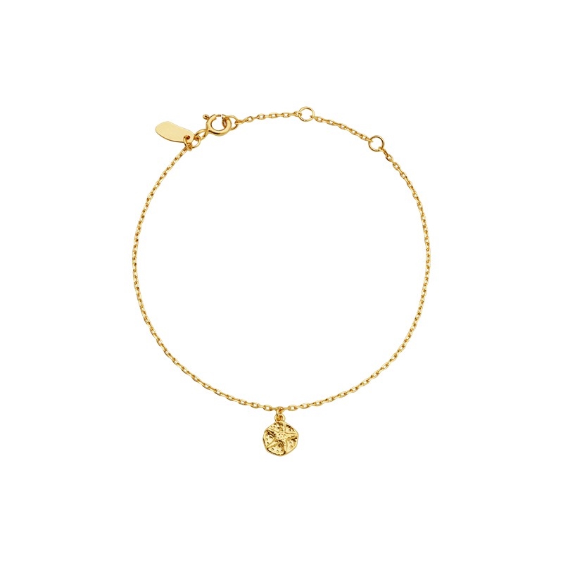 Armbåndet er fremstillet i forgyldt sterlingsølv, som giver en varm og blød glød til huden. Den fine kæde kombineret med det lille vedhæng formet som en let slået mønt med en søstjerne skaber et enkelt, men levende udtryk. Vedhænget måler 6 mm og tilfører et diskret, men karakterfuldt element, der gør smykket unikt uden at være dominerende.