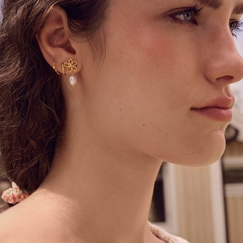 Tonia øreringe i forgyldt sølv fra Maanesten er feminine og detaljerige ørestikker med perler. Designet er asymmetrisk og giver et personligt udtryk, hvor den ene ørering prydes af en fin blomst, mens den anden bærer en grafisk sommerfugl. Kombinationen af de organiske former og de klassiske perler skaber et smykke, der både føles legende og elegant.