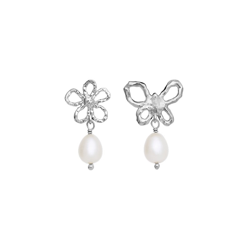 Tonia øreringe i sølv fra Maanesten er feminine og detaljerige ørestikker med perler. Designet er asymmetrisk og giver et personligt udtryk, hvor den ene ørering prydes af en fin blomst, mens den anden bærer en grafisk sommerfugl. Kombinationen af de organiske former og de klassiske perler skaber et smykke, der både føles legende og elegant.
