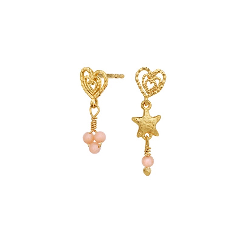 Øverst ses det dobbelte hjerte, som symboliserer kærlighed og samhørighed. Under det ene hjerte hænger små rosa perler, der tilfører et blødt og romantisk touch, mens den anden ørering prydes af en lille stjerne med en fin perledetalje. Det asymmetriske design giver et moderne og personligt look med masser af karakter.