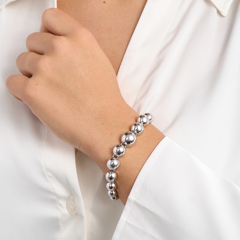 Det klare sterlingsølv fremhæver kuglernes form og giver armbåndet et elegant skær. Kombinationen af de forskellige størrelser skaber bevægelse og spil, når armbåndet bæres, og gør det til et smykke, der både kan stå alene og indgå i en mere personlig styling.