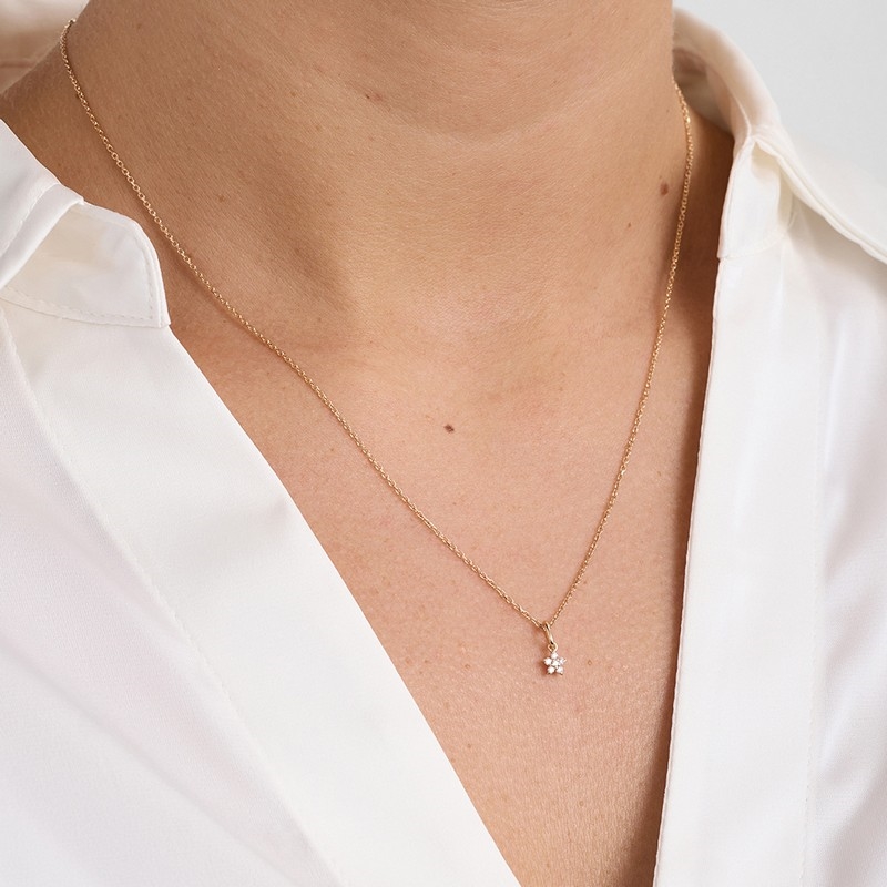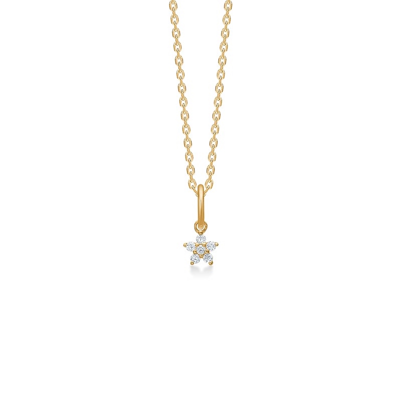 Vedhænget er sat med i alt 0,054 carat brillanter i kvaliteten Wesselton/SI. De seks små diamanter er placeret i stjernens takker, hvor de funkler side om side og skaber et levende spil i lyset. Brillanternes klare glans fremhæves smukt af det varme 14 karat guld og giver halskæden et eksklusivt udtryk, der føles både klassisk og moderne.