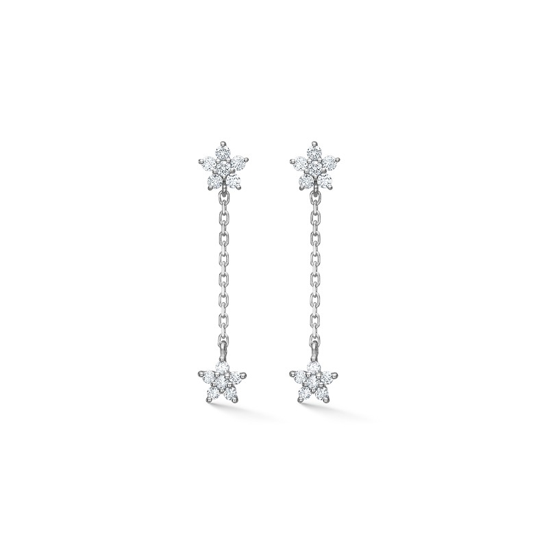 Designet tager udgangspunkt i den klassiske femtakkede stjerne, hvor hver tak er indrammet af klare zirkonia. På hver stjerne sidder i alt seks funklende sten, som tilsammen skaber et harmonisk spil i lyset. Kombinationen af stjernernes form, kædens lethed og zirkoniaernes glans giver øreringene et raffineret udtryk, der både føles feminint og moderne.