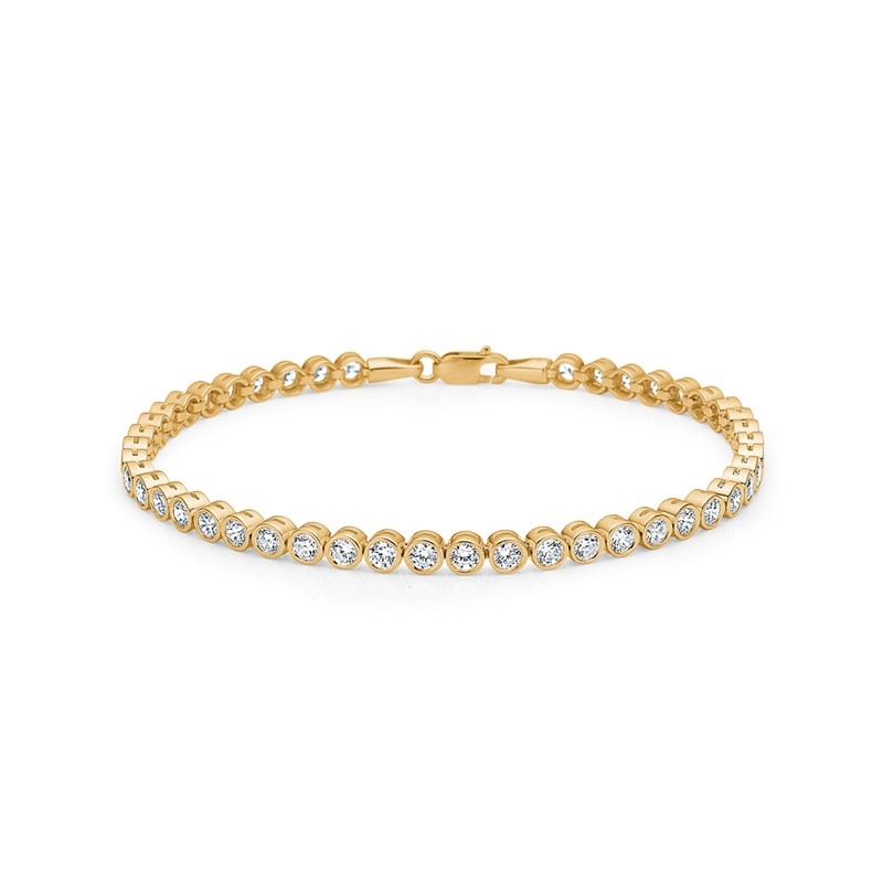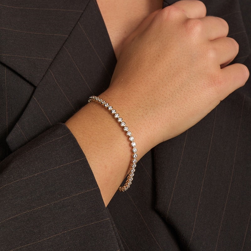 De facetslebne zirkonia reflekterer lyset klart og giver armbåndet et ensartet og markant skær. Kombinationen af 8 karat guld og hvide sten skaber et klassisk look, som fungerer både alene og sammen med andre armbånd.