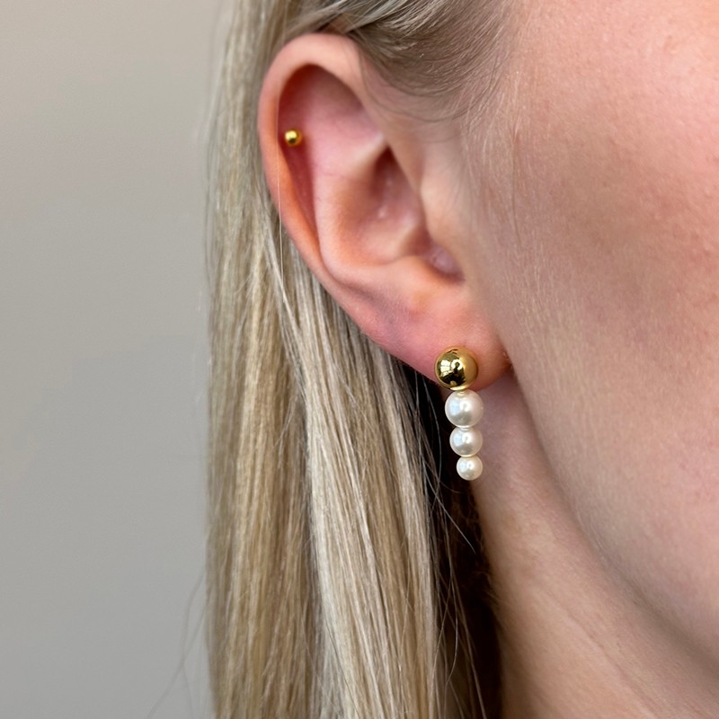 Carly Perleøreringe i forgyldt sølv fra Merleperle med 3 perler i forskellig størrelse på hver ørering. I toppen af øreringene sidder en blank perle i forgyldt sølv.