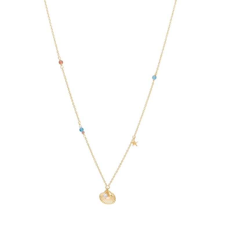 Halskæden er dekoreret med små farvede detaljer langs kæden, der leder tankerne hen på sol, sand og havets bløde nuancer. Det fine vedhæng har en form og struktur, der minder om en musling, og den lille perledetalje tilfører et feminint touch med reference til havets skatte. Den varme, gyldne overflade fanger lyset smukt og understreger smykkets lette og elegante udtryk.