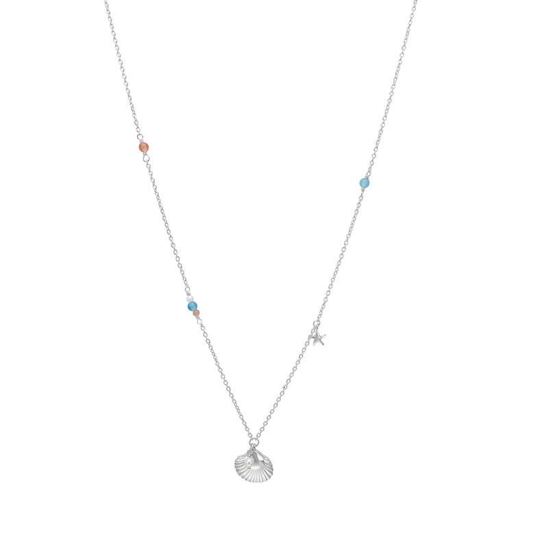 Halskæden er dekoreret med små farvede detaljer langs kæden, der leder tankerne hen på sol, sand og havets bløde nuancer. Det fine vedhæng har en form og struktur, der minder om en musling, og den lille perledetalje tilfører et feminint touch med reference til havets skatte. Den klare sølvoverflade fanger lyset smukt og understreger smykkets lette og elegante udtryk.