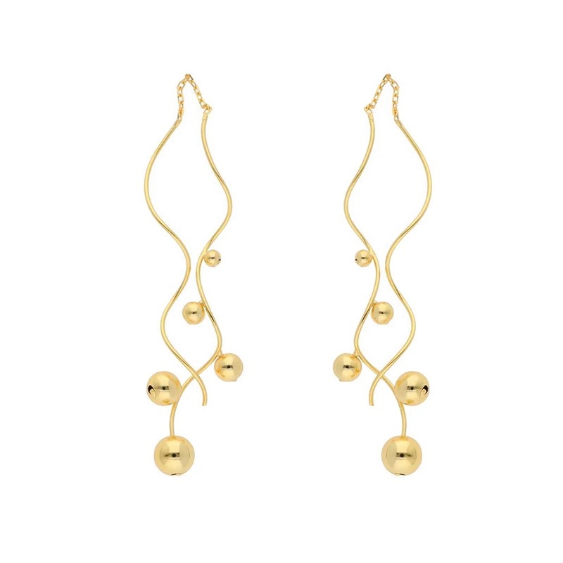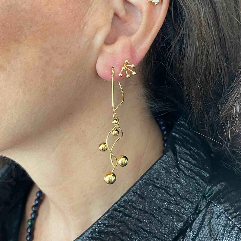 Langs den gyldne bue er små forgyldte perler placeret med lethed og præcision. De små kugler giver øreringene struktur og dybde og skaber et elegant samspil mellem den blanke metaloverflade og de runde former. De forgyldte sølvperler følger øreringens bevægelse og fremhæver det skulpturelle design, hvilket giver et eksklusivt og moderne udtryk.
