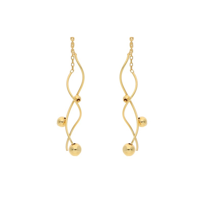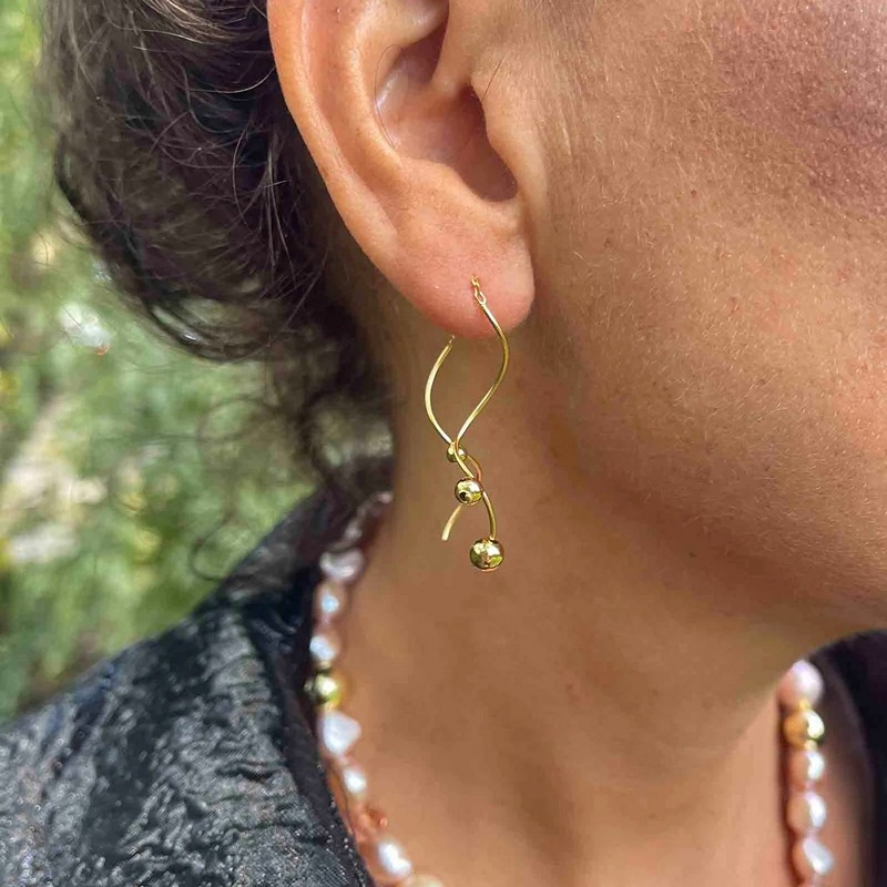 Langs den gyldne form sidder små forgyldte sølvkugler, som følger øreringens bølgende linje. I denne mindre version er der lidt færre kugler end på den store model, hvilket giver et lettere og mere enkelt look. De små kugler tilfører struktur og skaber et flot spil i lyset, når øreringene bæres.