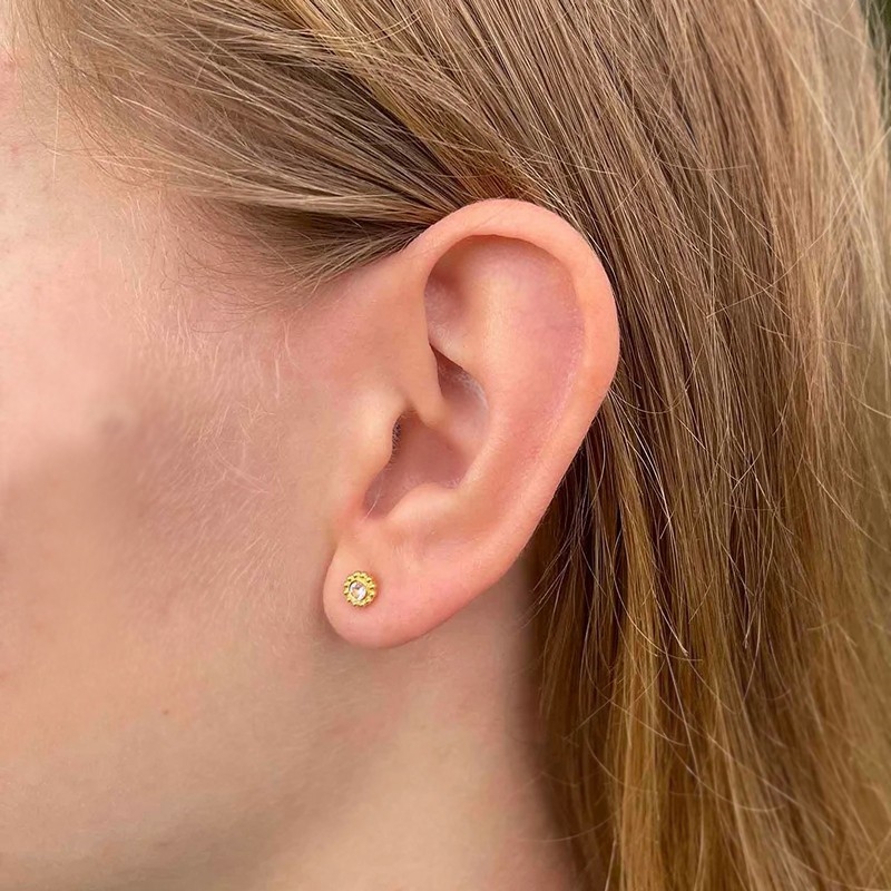 Øreringene er fremstillet i forgyldt sterling sølv (925) og har en størrelse på 5 mm. Den kompakte størrelse gør dem perfekte som hverdagsøreringe, der er lette at bære hele dagen. Samtidig giver den farvede sten et lille strejf af farve, som løfter dit look uden at blive for dominerende.