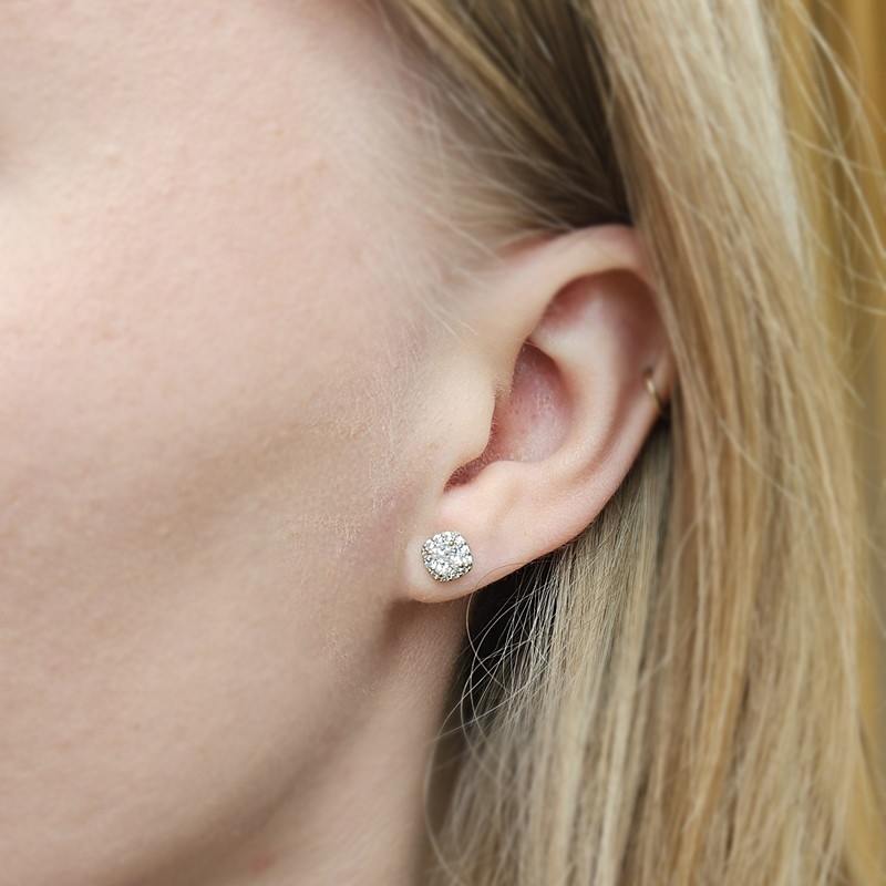 Roset ørestikker i sølv med firkantet zirkonia og små omkransende stenDisse fine ørestikker i 8 karat guld er designet i et klassisk rosetmotiv