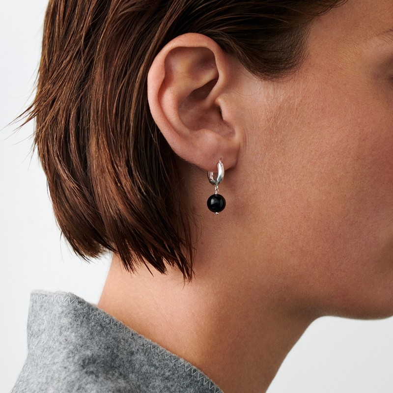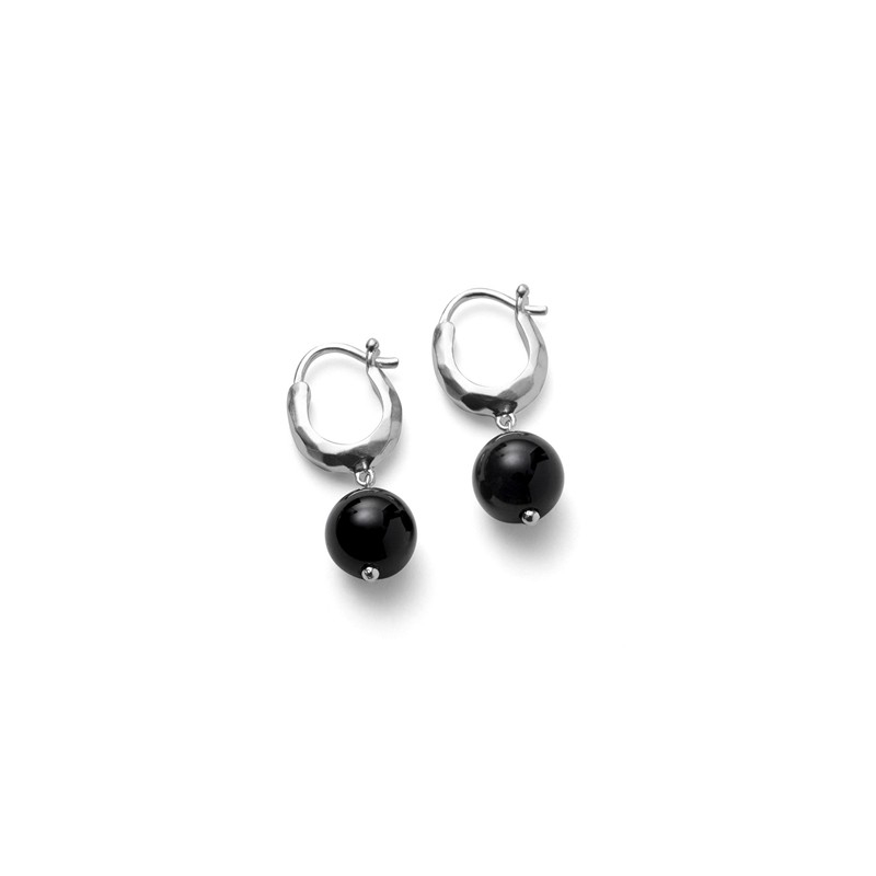 Hoop-delen er udført i sterlingsølv med en let banket overflade, der giver smykket et organisk og naturligt præg. Det blanke sølv står i smuk kontrast til de dybe, sorte onyxperler, og tilsammen skaber de en harmonisk balance mellem det lyse og det mørke. Resultatet er et sæt øreringe, der både er tidløse og moderne på samme tid.