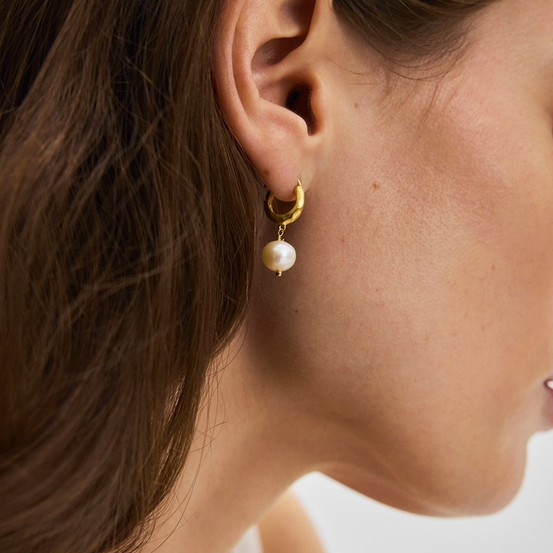 Den runde perle falder let under øreflippen og bevæger sig naturligt med dine bevægelser. Det skaber et blødt og levende udtryk, som gør øreringene både elegante og lette i deres fremtoning. Perlernes naturlige glans står smukt i kontrast til den varme forgyldning og giver et harmonisk og tidløst look.