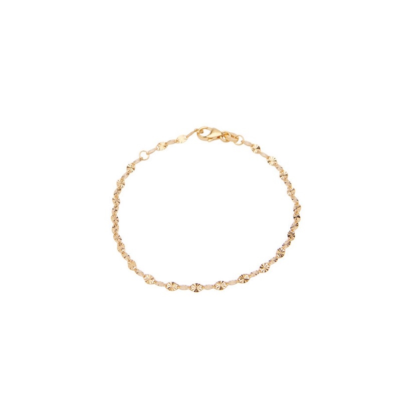 Armbåndet har en justerbar længde på 16 til 17,5 cm, så det sidder flot og behageligt på håndleddet. Den blanke forgyldte overflade giver en varm glød og fremhæver de fine detaljer i designet, hvilket gør det nemt at style med både neutrale og mere farverige outfits.